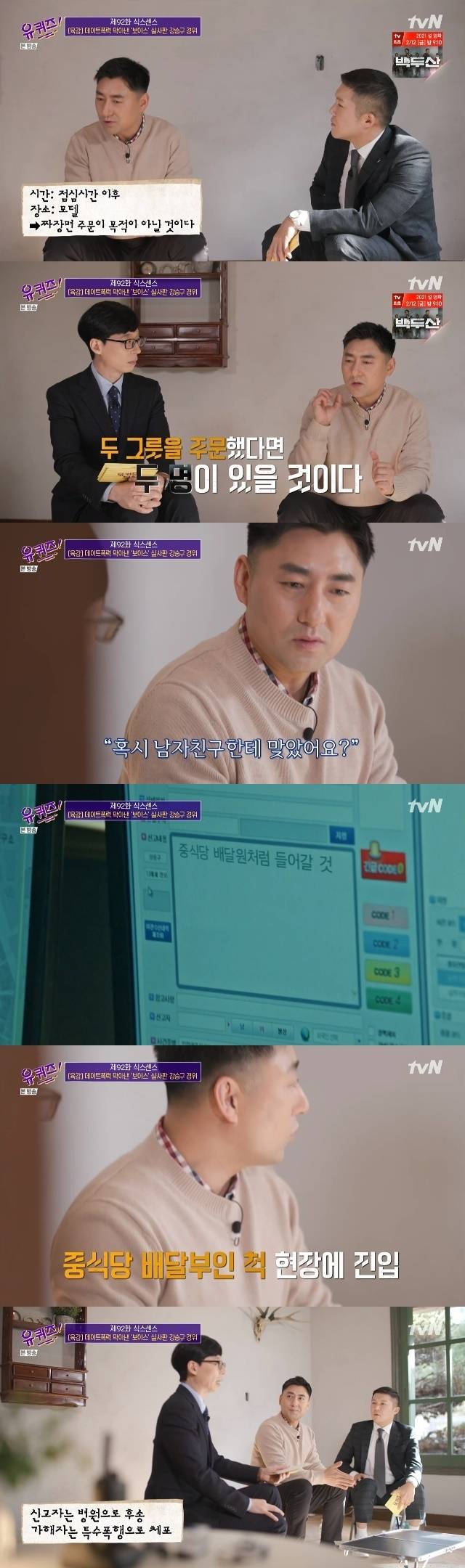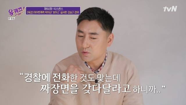 강승구 경위는 이어 "신고란에는 중식당 배달원처럼 들어가라고 써놓았다. 그래서 출동 경찰들이 들어갈 때도 중국집 배달온 것처럼 들어갔더니 여자분이 다치셨더라. 신고자는 병원에 후송하고 남자는 특수폭행으로 체포했다"고 이야기를 마무리지었다. (사진=tvN '유 퀴즈 온 더 블럭' 캡처)