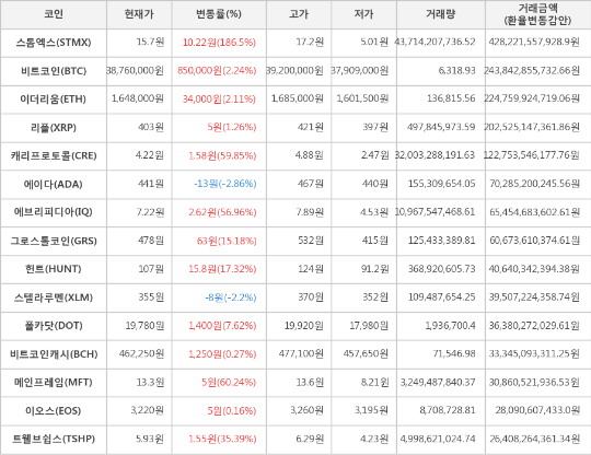 한편 거래금액 기준으로는 스톰엑스, 비트코인, 이더리움 순으로 가장 활발한 거래를 보이고 있다.