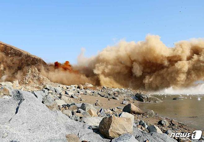 (평양 노동신문=뉴스1) = 북한 노동당 기관지 노동신문은 4일 지난 1일 오송지구에서 10만산 발파 작업을 진행했다고 보도하며 관련 사진을 실었다. 신문은 일꾼들과 건설자들이 결사 관철의 정신으로 열흘 동안 수십미터(m) 도갱굴진을 끝내고 10만산 발파를 성공적으로 진행했다고 설명했다.