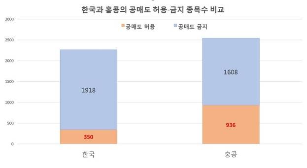 한 증권사 관계자는 "홍콩과 한국의 상장 종목 수는 각각 2544개와 2268개로 큰 차이가 없는데, 공매도 허용 종목은 936개와 350개로 차이가 크다"고 말했다. 이 관계자는 "이 정도로 제한적으로 허용해주면 사실상 공매도하지 말라는 거나 다름없다"고 불만을 표시했다.