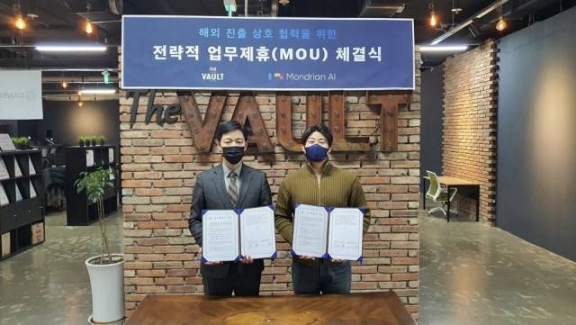 몬드리안에이아이(Mondrian AI, 대표 홍대의)는 벌트코리아(Vault Korea, 대표 지민규)와 3일 벌트코리아 사무실에서 해외 사업 개발 활동 및 전략적 협력체계 구축을 위한 업무협약(MOU)을 체결했다고 밝혔다.