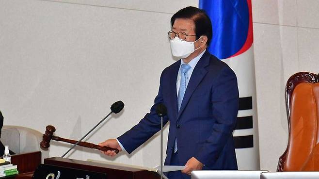 박병석 국회의장이 '법관 임성근 탄핵소추안'을 가결하고 있다.