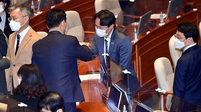 더불어민주당 이탄희 의원(가운데)이 '법관(임성근) 탄핵소추안'에 대해 투표를 마친 뒤 동료 의원들과 인사하고 있다.