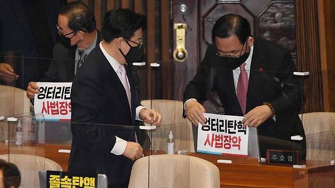 국민의힘 주호영 원내대표 등이 4일 국회 본회의장에서 임성근 법관 탄핵소추안 표결을 앞두고 반대하는 문구를 붙이고 있다.