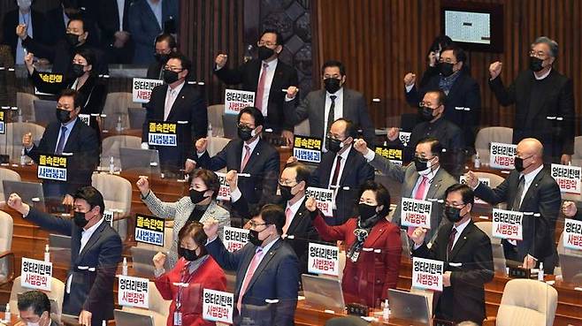 국민의힘 의원들이 '법관 임성근 탄핵소추안'이 가결되자 "사법장악 규탄한다, 김명수를 탄핵하라"를 외치며 항의하고 있다