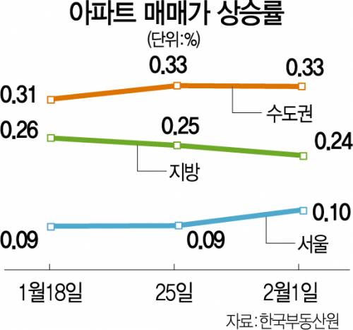 4일 한국부동산원이 발표한 주간 아파트 가격 동향 통계를 보면 이번 주 서울 아파트 매매가 상승률은 전주보다 0.01%포인트 오른 0.10%를 보였다. 서울 집값이 크게 오른 지난해 7월 초 0.11%의 변동률을 기록한 후 가장 높은 수치다.