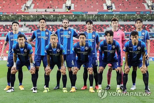 (서울=연합뉴스) 프로축구 K리그 울산 현대 선수들이 4일 오후(한국시간) 카타르 알 라이얀의 아흐메드 빈 알리 스타디움에서 열린 2020 국제축구연맹(FIFA) 클럽 월드컵 멕시코 티그레스 UANL과의 경기 시작에 앞서 기념촬영을 하고 있다. 2021.2.4 [한국프로축구연맹 제공. 재판매 및 DB금지]