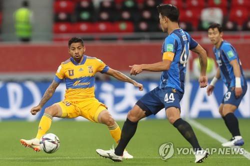 epa08986884 Javier Aquino (L) of Tigres in action against Kim Keehee of Ulsan during the 2nd round match between Tigres UANL and Ulsan Hyundai FC at the FIFA Club World Cup in Al Rayyan, Qatar, 04 February 2021. EPA/ABBAS ALI