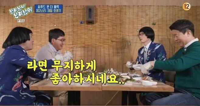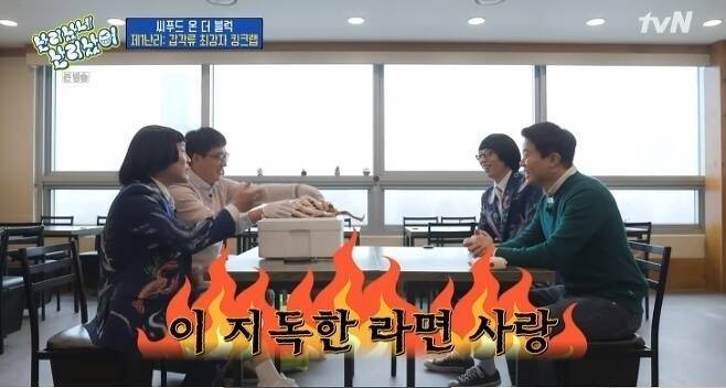 유재석은 바람대로 호래기 라면이 나오자 "제가 부탁한 적은 없는데"라면서도 "저는 배가 불러도 라면은 먹는다. 칼칼하니 좋다"고 만족감을 표했다. (사진=tvN '난리났네 난리났어' 캡처)