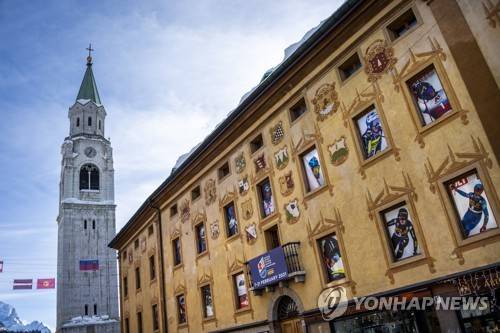 epa08989108 Posters of skiers are displayed in the windows of a building in the centre of Cortina d'Ampezzo, Italy, 05 February 2021. The 2021 FIS Alpine World Ski Championships will be held in Cortina d'Ampezzo from 07 to 21 February 2021. EPA/JEAN-CHRISTOPHE BOTT
