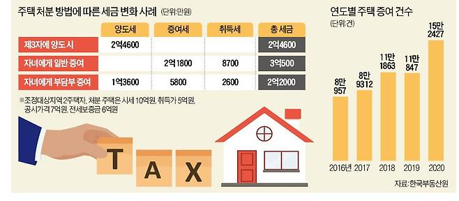 정부가 다주택자에 대한 세금 부담을 대폭 강화하면서 자식 등에게 주택을 미리 넘겨주는 증여가 빠르게 늘고 있다. 연간 증여 건수는 문재인 정부가 출범한 2017년 8만9312건에 머물렀지만 2018~2019년 연간 11만 건을 넘어선 데 이어 지난해 15만2427건으로 급증했다.