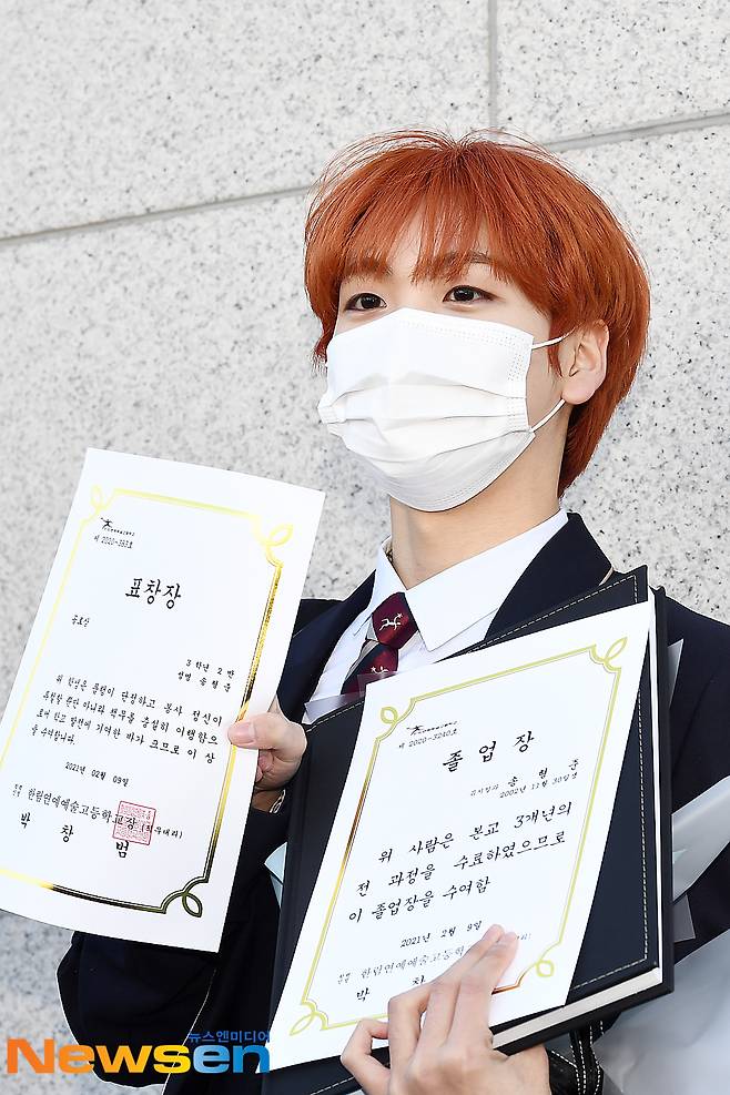 크래비티(CRAVITY) 멤버 형준이 2월 8일 오전 서울 송파구 장지동에 위치한 한림연예예술고등학교에서 열린 제 10회 졸업식에 참석해 포즈를 취하고 있다.
