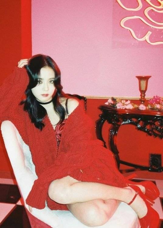 공개된 사진 속 지수는 키치하면서도 레트로한 분위기의 스튜디오에서 촬영에 임하는 모습. 빨간색 원피스와 카디건을 착용한 채 다양한 포즈로 매혹미를 발산하고 있다.