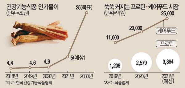 한국건강기능식품협회에 따르면 지난해 건강기능식품 시장 규모는 4조9805억원으로 전년(4조6699억원)보다 6.6% 신장했다. 성장세는 더 가팔라질 것으로 보인다. 권석형 한국건강기능식품협회장은 "2030년까지 시장 규모가 25조원에 달할 수 있다"고 설명했다. 홍삼은 대표적인 건강기능식품 아이템이다. 식품의약품안전처 건강기능식품 생산실적 자료에 따르면 홍삼 매출액은 2015년 6943억원에서 2019년 1조508억원으로 51% 성장했다.
