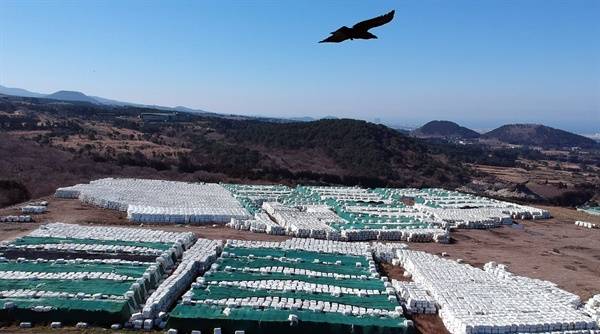 | ▲ 비닐로 감은 쓰레기 더미가 끝없이 쌓여 있고, 그 위를 까마귀가 날아다니고 있다. 이게 '쓰레기 섬' 제주도의 현실이다. |