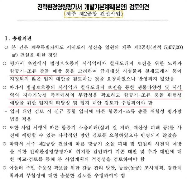 | ▲ 비행기와 철새와의 충돌 위험으로 공항의 부적정함으로 지적한 KEI의 제주제2공항 환경영형평가서 검토의견 |
