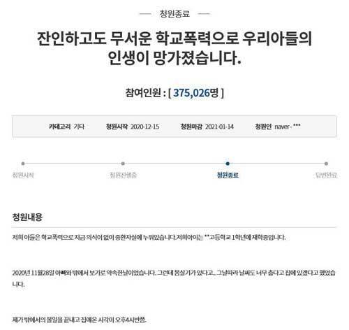 청와대 강정수 디지털소통센터장은 "현재 피해학생은 의식은 찾았으나 간단한 의사소통만 가능한 상태"라면서, 가해학생이 구속 기소된 상태에서 재판 결과 등에 대한 사항은 답변하기 어렵다고 설명했습니다.