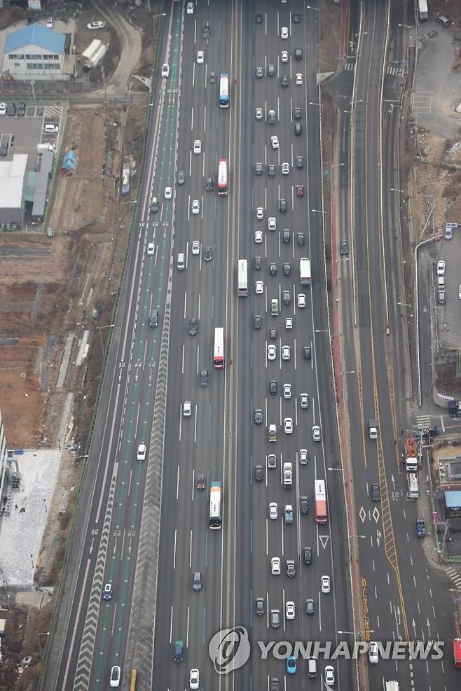 (용인=연합뉴스) 임화영 기자 = 설 연휴를 하루 앞둔 10일 오후 경찰청 헬기에서 바라본 경기도 용인시 신갈IC 인근 경부고속도로의 귀성 차량이 서행하고 있다. 2021.2.10
