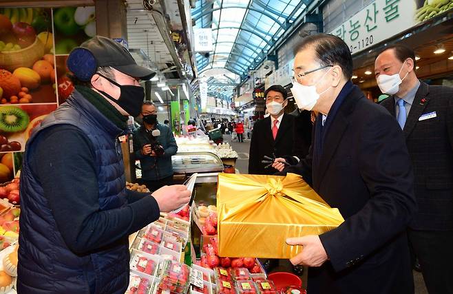(서울=연합뉴스) 정의용 외교부 장관이 10일 설 명절을 맞아 외교부와 자매결연한 서울 마포구의 월드컵시장을 방문해 온누리상품권으로 명절 음식을 구매하고 있다. 2021.2.10 [외교부 제공, 재판매 및 DB 금지]