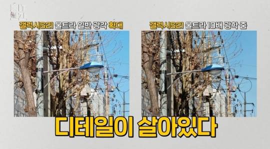 갤럭시S21 울트라는 전작보다 카메라가 개선됐습니다. 일부 마케팅적인 요소를 빼고 실생활에서 유용한 기능은 크게 (1)10배 광학줌 (2)근접 초점 자동 전환 이렇게 두 가지입니다. 전작인 S20 울트라는 4배 광학줌에 10배 하이브리드줌을 지원했는데요. 즉 화질 손상 없는 줌배율이 최대 4배이고 10배까지는 광학과 디지털을 섞은 형태였습니다. 보정이 들어간다고 해도 순수한 10배 광학줌에 비해 아쉬운 성능입니다. 10배 광학줌은 꽤 먼 거리까지 확대해도 화질 손상이 없어 만족스러운 기능으로 다가왔습니다. S21 울트라 일반 광각 카메라에서 10배 디지털줌과 비교했을 때 사진의 질감 차이는 꽤 컸습니다.