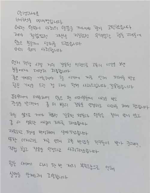 이어 '좀 더 성숙한 사람이 되도록 노력하겠으며 직접 뵙고 잘못을 인정하고 사죄하겠다'면서 '힘든 시기에 저의 부족함으로 실망을 안겨드려 죄송합니다'라고 했습니다.