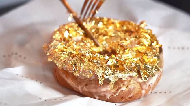 도넛 위에 번쩍번쩍하는 식용 금박까지 얹으면 황금 도넛 완성인데요.