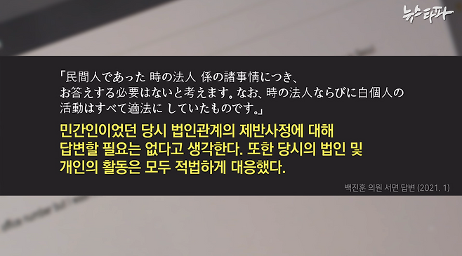 하쿠 신쿤 의원은 서면 답변에서 방 회장과의 관계나 송금 목적, 자금의 출처와 관련한 답변은 피한 채, “민간인이었던 당시 법인관계의 제반사정에 대해 답변할 필요는 없다고 생각한다”며 “당시의 법인 및 개인의 활동은 모두 적법했다”고만 답했다.