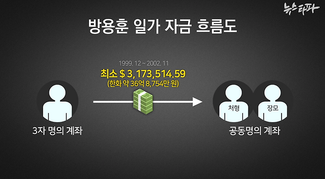 뉴스타파가 입수한 자금 이체 기록에 따르면 일본에 있는 제3자 명의로 방용훈 회장의 처형(김미경, 고 이미란 씨의 언니로 한국명은 이미경)과 장모(명 림, 한국명 임명숙) 공동명의의 캐나다 CIBC 은행 계좌에 송금된 돈은 모두 317만 3514달러다. 당시 환율로 환산하면 우리 돈 37억 원 가량이다. 송금은 1999년 12월부터 2002년 11월 사이에 4차례에 걸쳐 이뤄졌다. 뉴스타파가 입수한 기록만 이 정도 규모다. 일본에서 돈을 보낸 사람들은 과연 누구일까.