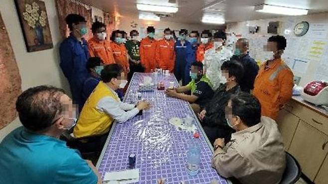 주이란 한국대사관 현장지원팀이 3일(현지시간) 이란 라자이항 인근에 정박해 있는 한국케미호에서 선원들과 면담하고 있다.