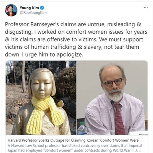 공화당 소속인 영 김 의원은 트위터를 통해 "램지어 교수의 주장은 진실이 아니고, 사실을 오도할 뿐 아니라 역겹다"며 이같이 밝혔습니다.
