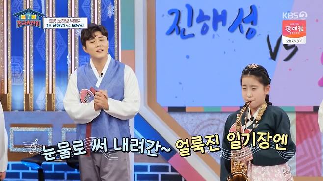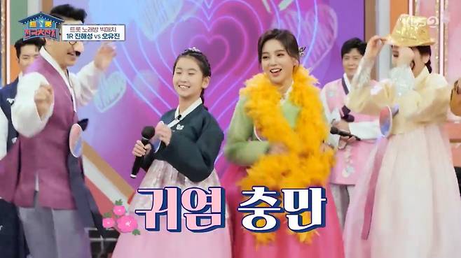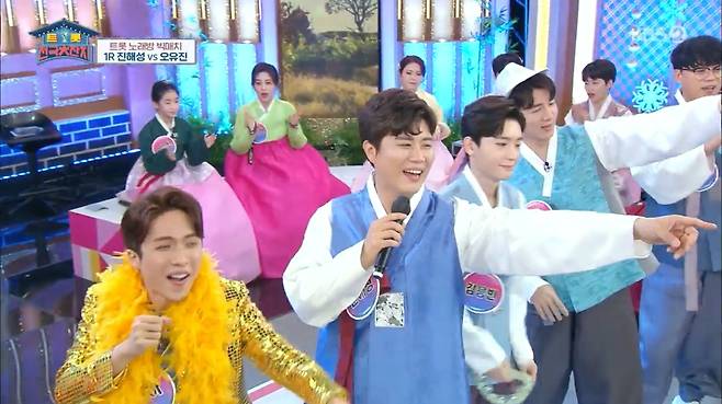 이날 팔도 특산품을 건 첫 번째 대항전에는 '트롯 전국체전'에서 삼촌과 조카 케미를 자랑하는 진해성과 오유진이 대결을 펼쳤다.