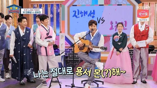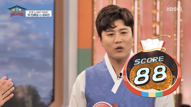 진해성은 나훈아 '머나먼 고향'을 선곡해 구성지고 맛깔난 음색으로 88점을 기록했다. 이에 대적하는 오유진은 금잔디의 '오라버니'로 귀여운 모습으로 보였고, 91점으로 승리했다.