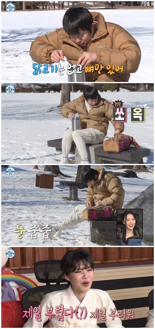 이어 옷에 묻은 양념을 지우기 위해 바닥에 있는 눈을 이용했다. 양념 지우기에 실패하자 물티슈를 찾아냈다. 그는 물티슈 상단에서 뽑아 쓰지 않고 옆으로 뜯었다. 제작진이 물티슈 뽑는 영상을 보여주자 "아, 저렇게 하는거구나"라고 말했다.