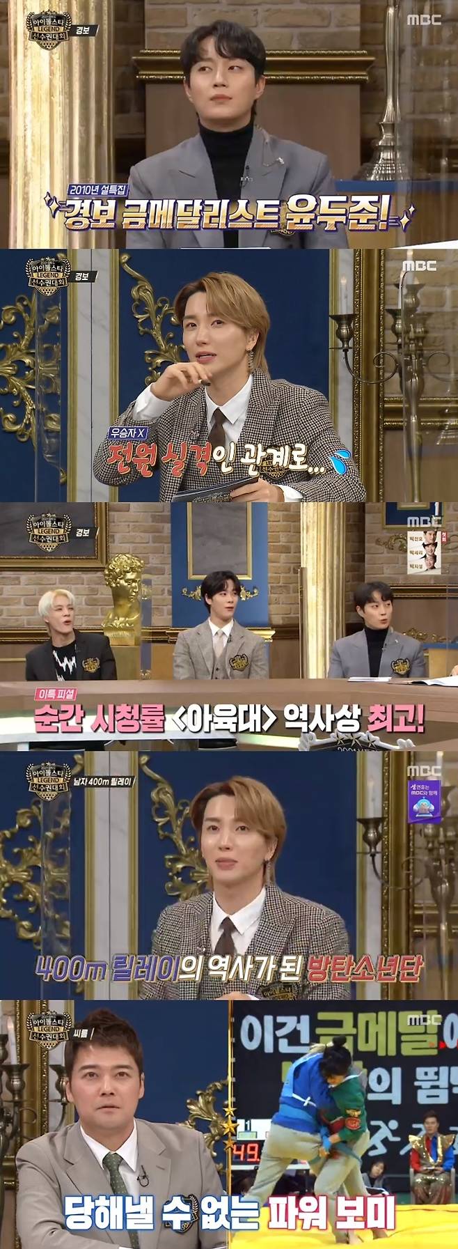 먼저 이특은 사상 초유 전원실격을 당했던 경보 경기를 떠올렸다. 당시 이특을 포함한 남자 아이돌들은 경보 대결에서 발을 떼고 달려 전원 실격됐다. 팔자걸음으로 달리는 이특의 포즈가 화제되기도. 이특은 후배 아이돌들에게 웃음 보장 경보 자세를 전수했다.