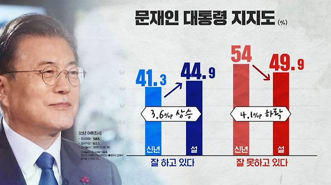 신년 여론조사와 비교하면, 긍정이 3.6%포인트 늘고, 부정 평가가 4.1%포인트 줄었습니다.
