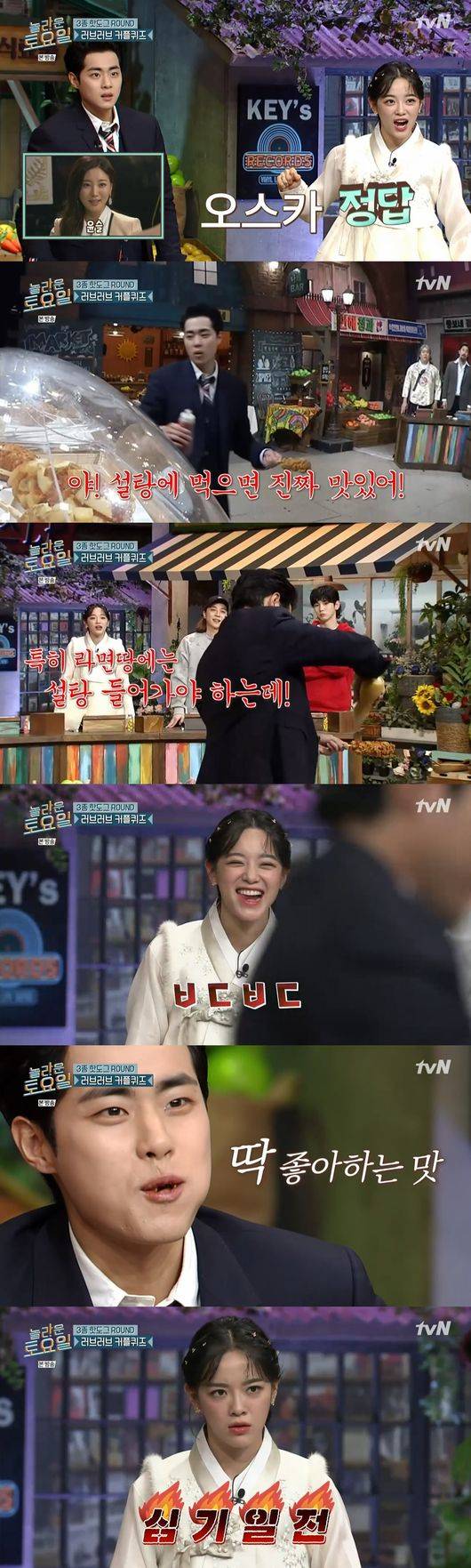 이날 3종 핫도그가 걸린 러브러브 커플퀴즈가 시작됐다. 화면에 드라마 캐릭터가 뜨면 그 캐릭터의 커플 캐릭터를 맞추는 퀴즈. 조병규는 드라마 '시크릿가든'의 윤슬이 나오자 바로 "오스카"라고 대답해 정답에 성공했다. 조병규는 웃으면서 나갔고 이 모습을 본 세정은 "꼴뵈기"라고 말해 웃음을 자아냈다.