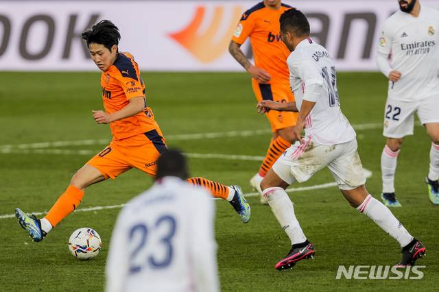 [마드리드=AP/뉴시스]발렌시아 이강인(왼쪽)이 14일(현지시간) 스페인 마드리드의 에스타디오 알프레도 디 스테파노에서 열린 2020-21 스페인 프리메라리가 23라운드 레알 마드리드와의 경기에 후반 교체 출전해 경기하고 있다. 이강인은 공격 포인트를 올리지 못했고 발렌시아는 0-2로 패했다. 2021.02.15.