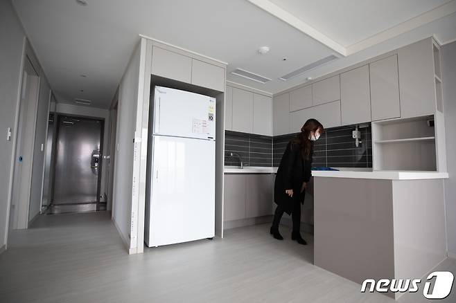 사진은 15일 오전 서울 용산구 용산베르디움 프렌즈에서 관계자가 견본주택을 살펴보고 있다. 2021.2.15/뉴스1