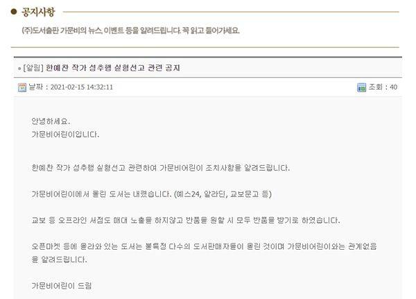 재판 소식이 알려지자 한 씨의 책을 펴낸 가문비 출판사는 오늘(15일) 대형 온·오프라인 서점에서 한 씨의 책을 모두 회수하고 판매를 중단하겠다고 밝혔습니다.