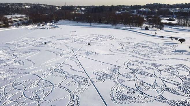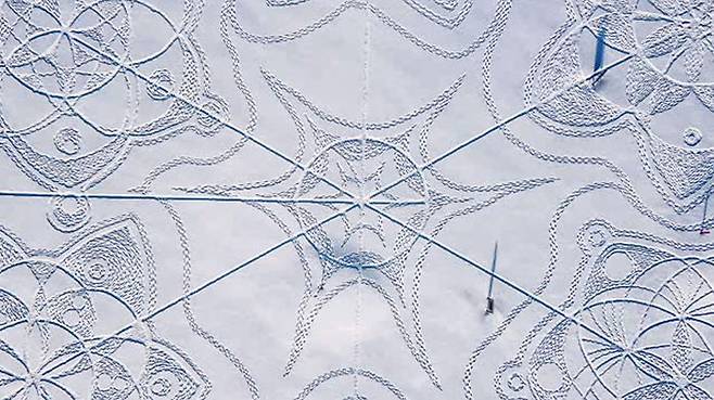 아마추어 예술가 잔느 퓌쾨 씨가 자원봉사자 11명의 도움으로 작품을 완성했는데요. 퓌쾨 씨는 육각 결정의 기하학무늬를 컴퓨터로 디자인했고, 봉사자들은 특별히 제작된 스노우 슈즈를 신고 설계도대로 눈밭을 걸었습니다.