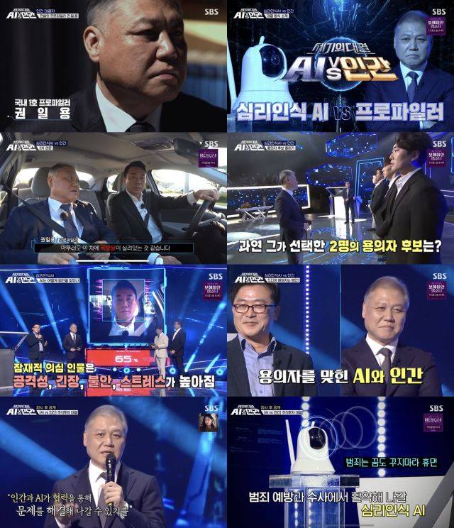 3화 심리 인식 AI는 범죄자의 심리를 분석해 폭발물을 운반하려다 탐지견에 적발된 인물을 가려내는 미션을 받았다. 대결자는 프로파일러 권일용이었다. 방송에서 공개된 진짜 범인은 2번. 인간과 AI가 지목한 인물도 동일하게 2번이었다. 권일용은 “2번은 불필요한 답변과 지나치게 단호한 태도를 보였다”고 설명했다. 심리 인식 AI는 “의심 인물은 공격성, 긴장, 불안, 스트레스가 높아지는데 2번 실험맨은 미션을 받은 직후 의심도 수치가 가장 높았다”고 했다.