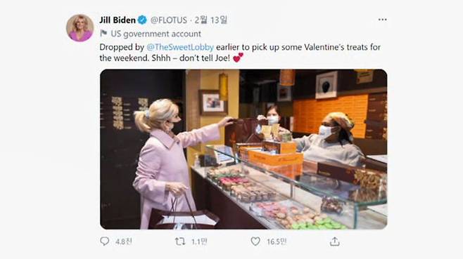 밸런타인데이를 이틀 앞둔 지난 12일, 질 바이든 여사는 워싱턴DC의 마카롱 가게에서 남편에게 줄 선물을 사는 사진을 SNS에 올렸습니다.