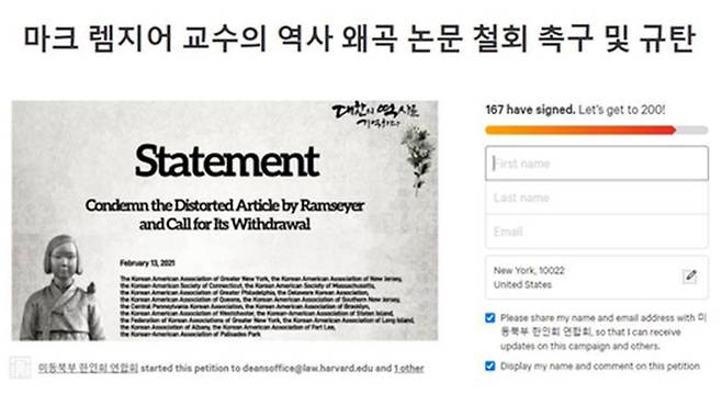 미국 동북부 한인회연합회는 세계 최대 청원 사이트 '체인지'(change.org)에 "램지어 교수의 역사 왜곡 논문을 강력히 규탄하며 해당 논문의 즉각적인 철회와 진정성 있는 사과를 촉구한다"는 내용의 청원을 현지 시간 16일 올렸습니다.