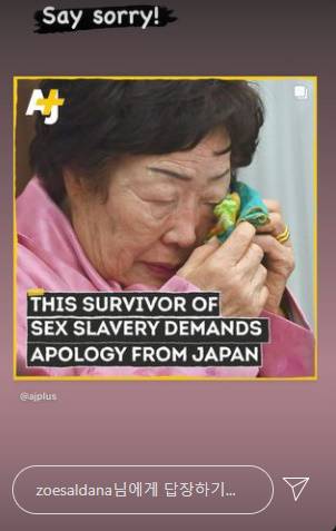 [마이데일리 = 곽명동 기자]영화 ‘아바타’ '어벤져스' '가디언즈 오브 갤럭시' 등으로 한국 팬에게 잘 알려진 배우 조 샐다나가 일본 위안부 문제에 대해 사과하라며 목소리를 냈다.