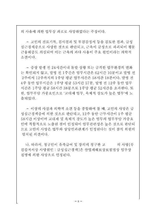 이에 대구업무상질병판정위원회는 관련법에 근거해 장 씨의 근무시간을 산정했고 또 장 씨가 숨지기 전 마지막 12주동안은 평균 58시간 40분을 일했다고 결론 내렸습니다.