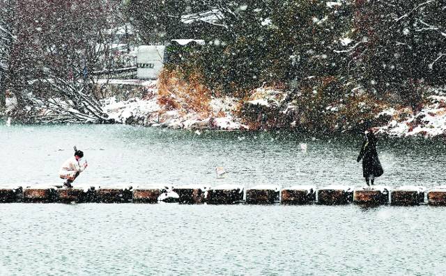 [포토] 눈 내리는 雨水, 징검다리 위에서 한 컷