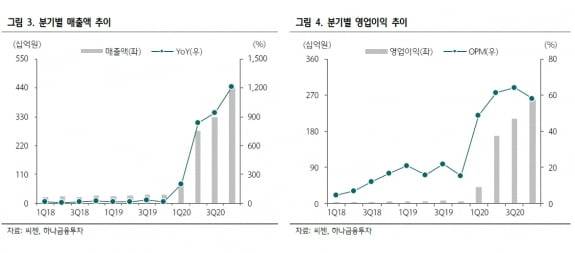 4분기에는 매출 4417억원, 영업이익 2575억원으로 분기 최대 실적을 냈다. 전년 동기 대비 각각 1207.9%, 4921.9% 늘어난 수치다. 3분기 매출 3269억원, 영업이익 2094억원보다 각각 35.1%, 22.7% 증가했다.