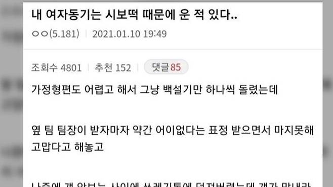글쓴이는 시보를 끝낸 동기가 형편이 어려워서 백설기만 하나씩 돌렸더니 옆 팀 팀장이 이를 쓰레기통에 버렸다더라며 당사자는 눈물을 흘렸다라고 전했습니다.
