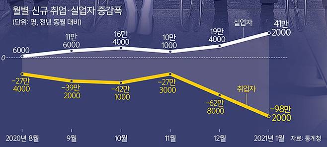 혹독한 고용한파는 지표가 보여준다. 15일 통계청의 ‘1월 고용동향’에 따르면 지난달 국내 전체 취업자는 2581만8000명으로 지난해 동기 대비 98만2000명 줄었다. 외환위기 때인 1998년 12월(-128만3000명) 이후 최대 감소폭이다. 취업자는 코로나19가 확산한 지난해 3월부터 11개월 연속 감소세다. 연령대별로는 청년층(15∼29세) 취업자가 31만4000명 줄어 감소폭이 가장 컸다. 60세 이상(-1만5000명)도 2010년 2월(-4만명) 이후 처음 감소하면서 모든 연령층에서 취업자가 줄었다. 반면 실업자는 157만명으로 오히려 41만7000명 늘었다. 실업자 규모는 1999년 6월 통계작성 이후 최대 규모다.