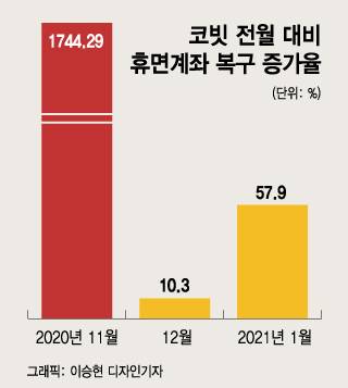 ‘돌아온 투자자’도 많았다. 국내 거래소 코빗의 전월대비 휴면계좌 복구 증가율은 지난해 11월 1744.29%에 달했다. 코빗의 휴면계좌 복구 절차 간소화가 비트코인 시세급등 시기와 맞물리면서 계좌를 다시 활성화한 투자자들이 많았다. 휴면계좌 복구 증가율은 지난해 12월 10.3%, 올 1월에는 57.9%였다.